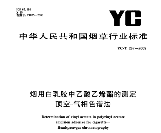 YCT 267-2008 煙用白乳膠中乙酸乙烯酯的測(cè)定頂空-氣相色譜法 YC/T267-2008煙用白乳膠中乙酸乙烯酯的測(cè)定頂空-氣相色譜法 本標(biāo)準(zhǔn)規(guī)定了煙用白乳膠中乙... 更新日期:2020-05-09 下載包(1)